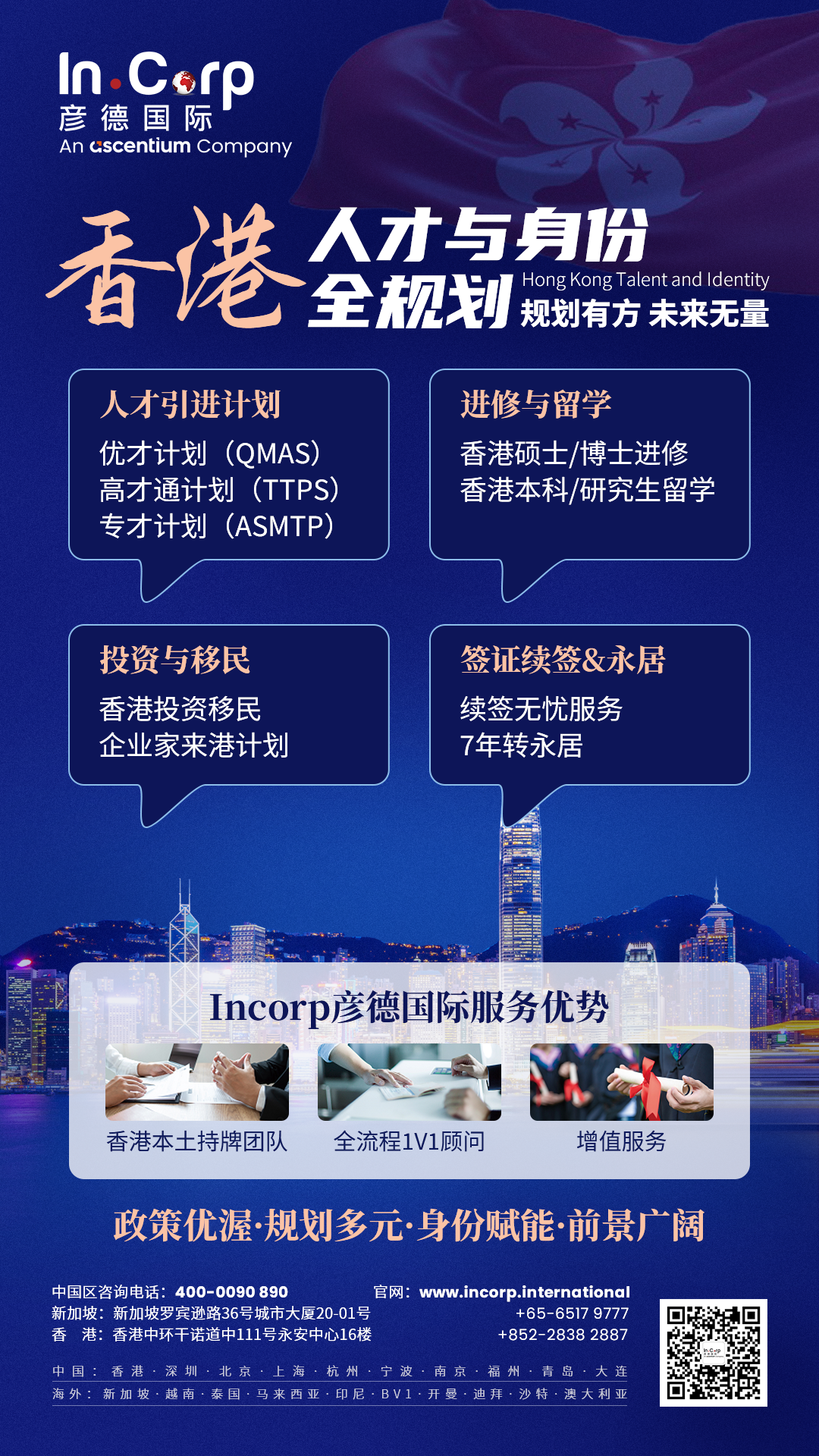 香港优秀人才入境计划是香港政府为吸引全球高技术人才或优秀人才来港定居而设立的移民计划。该计划无需提前获得香港雇主聘用,申请人可凭借个人能力(如学历、工作经验、专业成就等)获得香港居留权,配偶及未成年子女可随行。彦德国际依托新加坡总部布局及全球资源,香港直营团队深耕多年香港优才新政落地后的精准规划服务,聚焦“资质评估-申请落地-续签永居”全闭环,为符合条件的人才提供定制化、合规化香港优才解决方案,适配新政“精准筛选、价值绑定”导向,助力高效获取香港居留资格,衔接身份与发展双重需求。