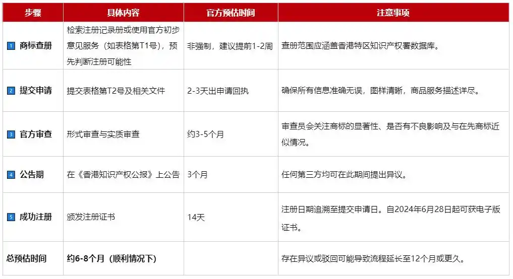香港商标注册的预估时间通常为6至8个月,但这一时间线仅适用于“没有缺陷或异议”的理想情况。在实际操作中,如果申请表格存在填写不足、商标被审查员提出反对,或在公告期内遭遇第三方异议,整个流程可能会被延长至12个月甚至更久。企业必须在进行市场推广前,预留充足的时间以应对可能出现的延误,并做好应对驳回或异议的准备。