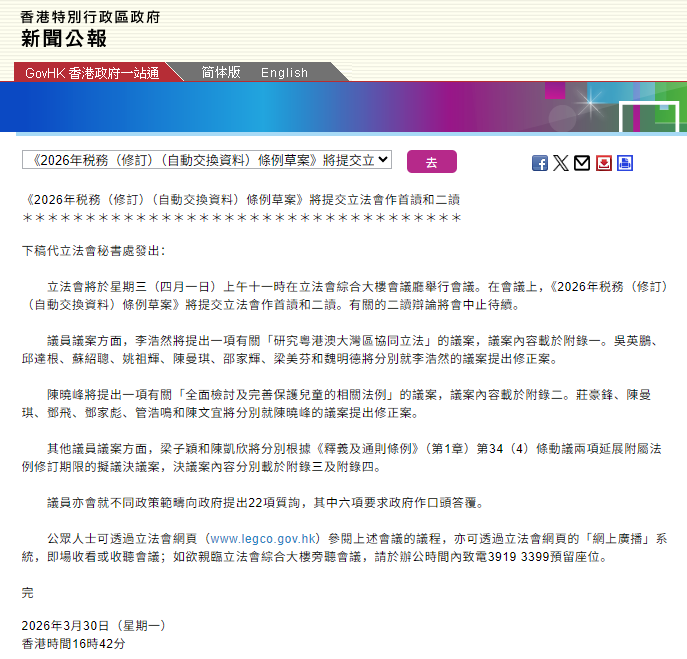 3月27日,香港《2026年税务(修订)(自动交换资料)条例草案》正式刊宪,4月1日提交立法会首读,香港全面启动CRS 2.0(即CRS修订版与加密资产申报框架CARF的统称)立法程序。与此同时,开曼、BVI等主流离岸金融中心已率先在2026年1月1日落地CRS 2.0相关规则。这场全球税务透明化革命正在重构跨境资本流动规则。